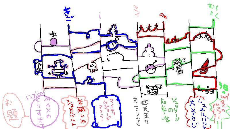 【上段、左から】むらさく(冬のムジョー、アチョー)、きごさん(マイティ、ムジョーでマフラー)、文字入れ(jackさん)/飾りつけ(肉うどんさん)